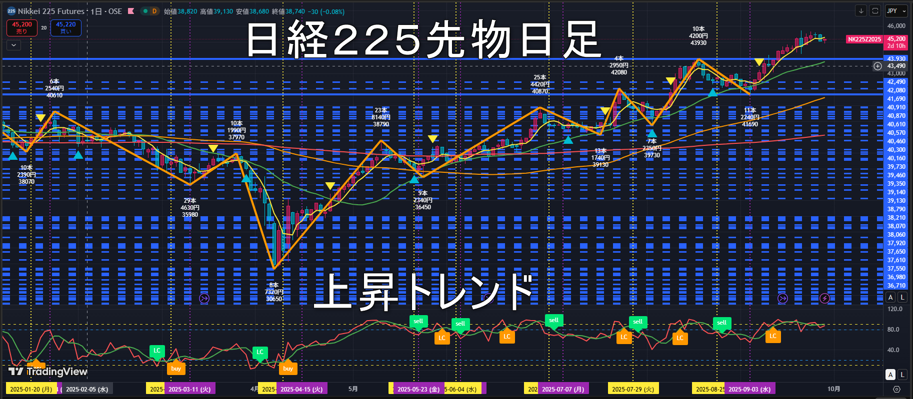 日経225先物の日足チャートは高値切り上げ、安値切り上げの上昇トレンド。