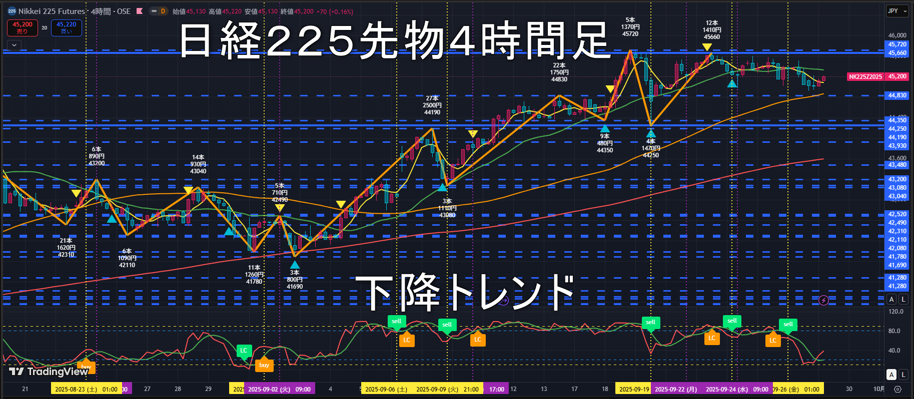 日経225先物の4時間足チャートは高値切り下げ、安値切り下げの下降トレンド。