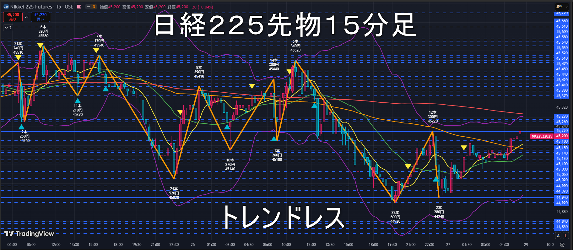 日経225先物15分足チャートは高値切り下げ、安値切り上げのトレンドレス。